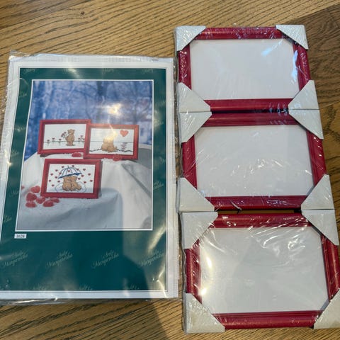 Broderipakke med to bilder. Tilhørende rammer med yttermål 24,5 x 24,5 cm.
