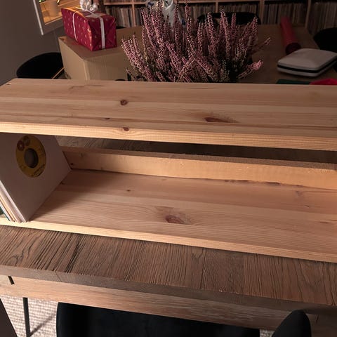 Skapet har dør foran og "lokk" i glass. Det er hull til kabelføring til platespiller samt en åpen hylle under. Nederste hylle har en flyttbar skillevegg for å skille de gode platene fra de dårlige.