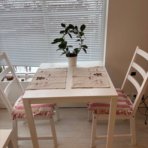 Bord med stoler selges samlet, veldig lite og fint brukt. Bordet er av glass og kan gjøres kortere og lengre. Kommer med 6 stoler. Stuebord selges også som vist i bildet, laget av glass.