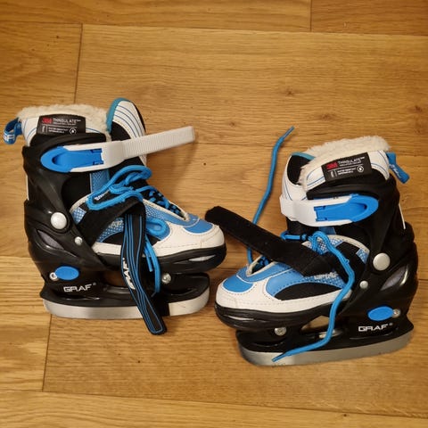 Barneskøyter i størrelse 27-30 (kan justeres). Skøytene har justerbare stropper og er i god stand. Svært lite brukt.