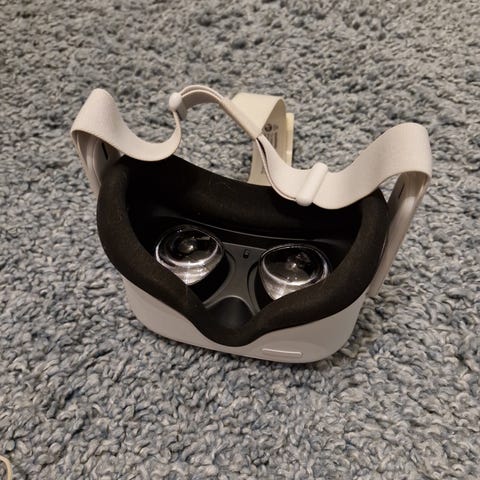 Meta Quest 2 VR-headset med tilhørende håndkontroller og tilbehør. Hodesettet er utformet for virtuell virkelighet og inkluderer justerbare stropper for komfortabel passform. Kontrollerne har knapper og sensorer for interaksjon i VR-miljøer.. med elite strap