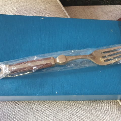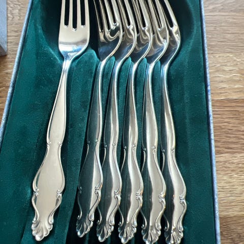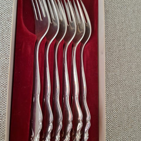 6 gafler sølvplett 60g. 17. 7cm. Selges for 250kr samlet.