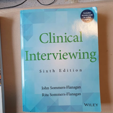 Selger «Clinical interviewing» bok av John Sommers-Flanagan og Rita Sommers-Flanagan. 6. utgave. ISBN 978-1-119-21558-5. Kjøpt som pensum på profesjonsstudiet i psykologi ved UIO. I fin stand, ingen markeringer. Det er lagt kontaktpapir utenpå boken for at den skal holde bedre.