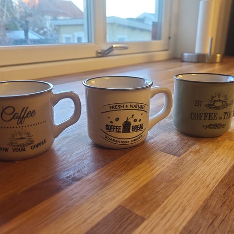 Keramiske kopper med mønster i beige og brune toner. Kopper med en kombinasjon av glatte og strukturerte overflater, egnet for servering av varme og kalde drikker.