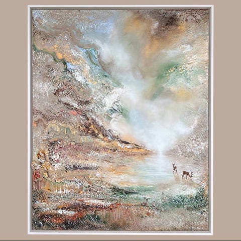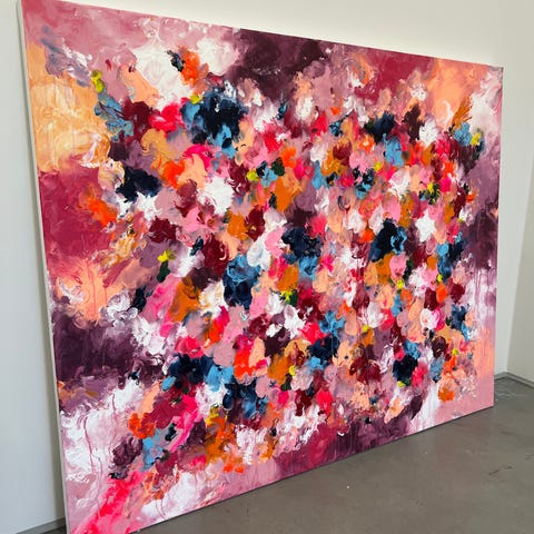 Abstrakt maleri med motiv i lilla og gul farge. Kunstverket har en leken og fargerik stil med tydelige konturer og tekstur. Kan brukes som dekorasjon i hjem eller kontor. L:140cm B:100cm