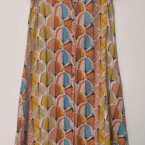 Vintage geometrisk mønstret frotté kjole fra 60-70tallet. Deilig og myk frotté stoff, tipper bomull. Veldig flatterende snitt. Pent og lite brukt av meg, da den har vært for liten i noen år. Kjøpte den vintage på uff for over 25 år siden. Noen hvite nupper i stoffet nederst på kjolen, se bildene. Synes ikke godt ved bruk. Passer str 38-40. Ingen lapp i kjolen, så se mål.