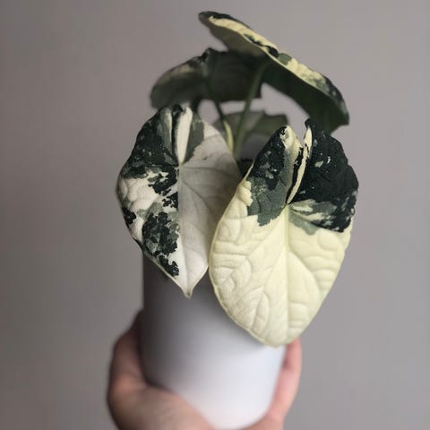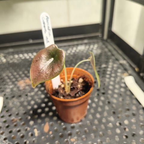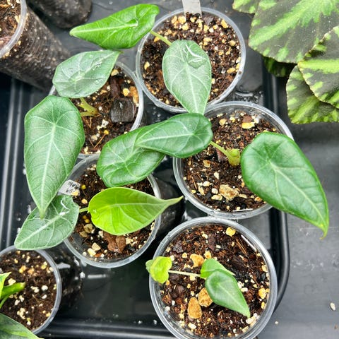 Selger etablerte ungplanter av Alocasia Melo. Disse vokser i høy luftfuktighet hos meg og har begynt å få de karakteristiske Melo-bladene med vaker tekstur.