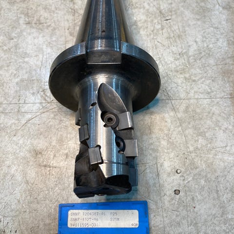 Iscar 3M F90AX D63-27-20, med ok skjær. Ser ikke så bra ut, men alle skruer og skjærleier er bra.