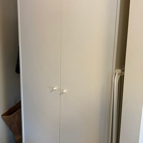 Skapet er pent brukt og i god stand. Det har en dør med hylleseksjon i full høyde og en større del med to dører hvor det er mulighet for kleshengere i tillegg til to brede hyller nederst.