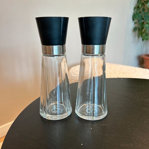Rosendahl salt- og pepperbøsse sett i klart glass med sorte lokk. Egnet for bruk i kjøkken og spisebord for krydderoppbevaring.