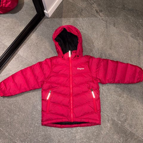 Pent brukt Bergans dunjake str 110, mørk blå med rosa detaljer. Rosa inni. Glidelås litt treg. Ingen hull eller skader, veldig god og varm og favoritt hos oss.