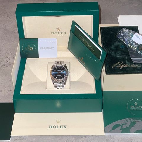 Følger med Rolex servicekort, papirer på trykktest og detaljert kvittering fra utført service.