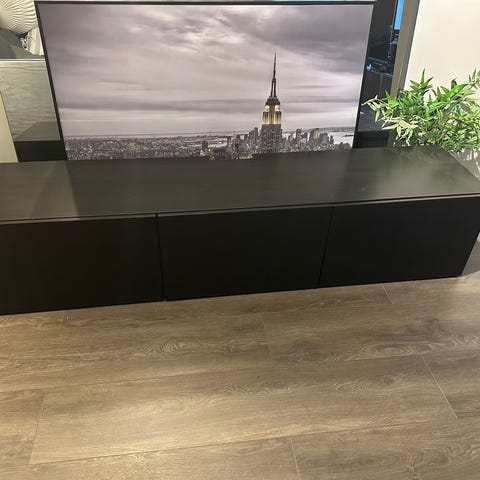 IKEA BESTÅ TV-benke i hvit farge med skuffer og åpne hyller. Passer for oppbevaring og plassering av TV og elektronikk.Benk har blitt brukt pent og har ingen slitasje eller skader.