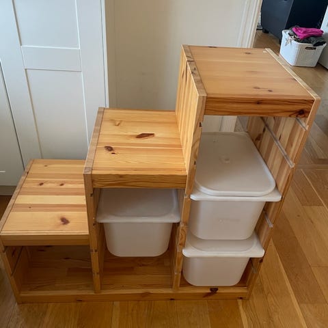 Fronten på skuffen har nå en sort kontaktplass på, den er det nok mulig å ta av slik den blir hvit. Har noen hakk. Også limt på to ting på den ene siden, (se bilde) eller så er den i godt stand, to kasser for opp av leker følger med