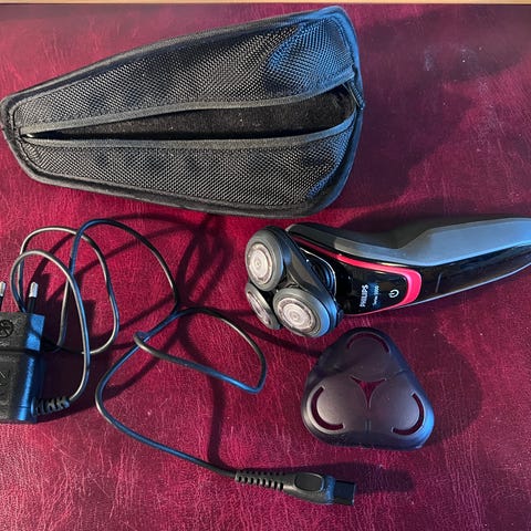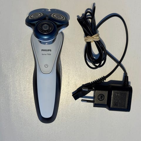 Philips Series 7000 elektrisk barbermaskin med ladeadapter og reiseetui. Barbermaskinen har et ergonomisk design og tre roterende barberhoder for effektiv barbering. Veldig lite brukt og blir rengjort nøye før salg