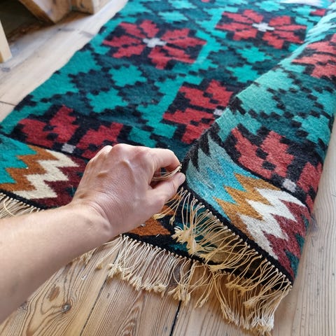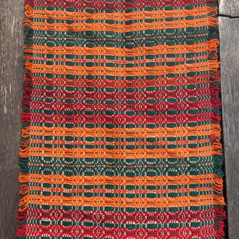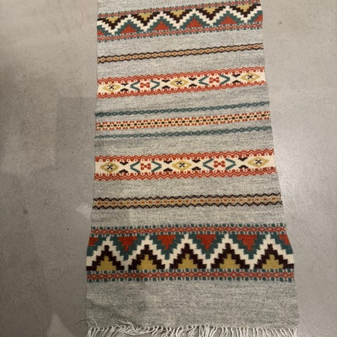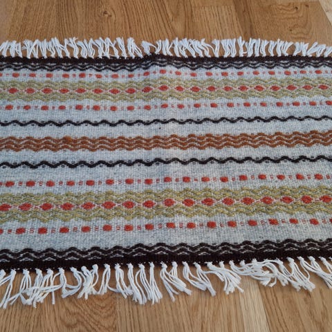 Vevd i et litt mykere ullgarn. Vakre, behagelige jordfarger. Helt og pent, ingen flekker eller hull. Like fint på begge sider. Noen få løsere tråder, se bilder for eksempel. Ingen lukt.