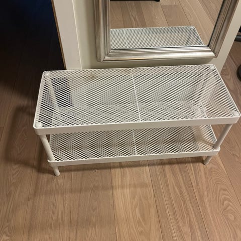 Enkel skohylle i lyst tre med pute selges. Puten kan enkelt tas av og på.