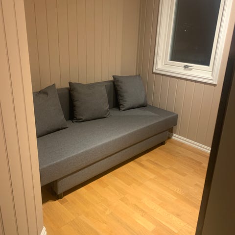 Pent brukt sovesofa med noe dekorering fra kreative barn. Det er tegnet litt med blå tusj på begge armlen. Praktisk oppbevaring under sjaselong. 3 år gammel. Nypris 10.000.
