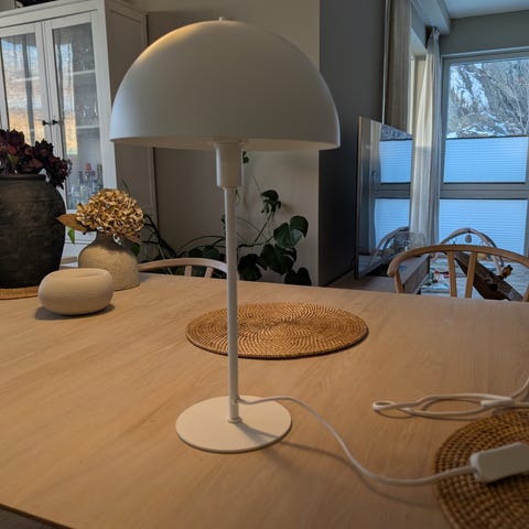 2 stk lamper gis bort grunnet overgang til nye. Den en sokkelen er litt skeiv, men står fint på bordet. To ulike pærer- den ene lyser litt mer enn den andre:)