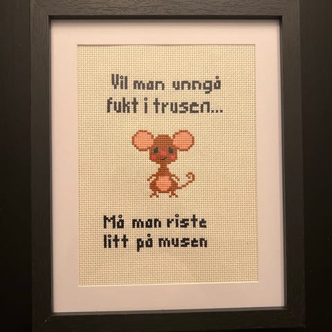 Brodert tekstbilde med teksten "Gammel røy er også sukkertøy". Bildet er innrammet og dekorert med små motiver av sukkertøy og kaker. Passer til dekorasjon og som humoristisk veggkunst.