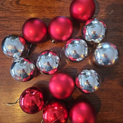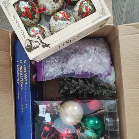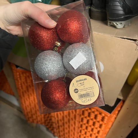 3 pakker a 12 røde kuler gis bort. Ikke brukt..