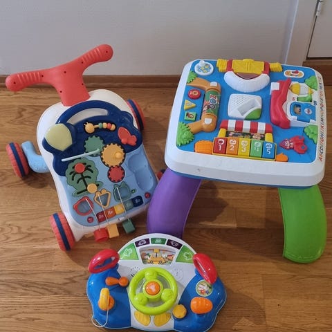 Fisher-Price barneleker med forskjellige typer lyd- og aktivitetsleker i ulike farger og former. Passer for små barn og bidrar til tidlig læring og motorisk utvikling.