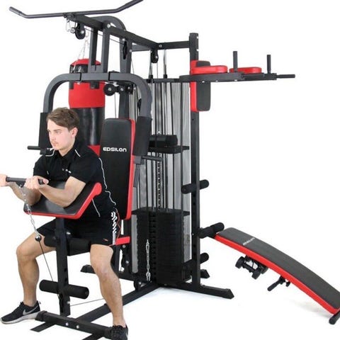 Multigym treningsapparat med vektmagasin for styrketrening. Utstyrt med ulike håndtak og polstrede sitte- og ryggputer for komfort under trening. Passer for hjemmebruk og gir mulighet for flere forskjellige øvelser som benpress, brystpress og nedtrekk.
