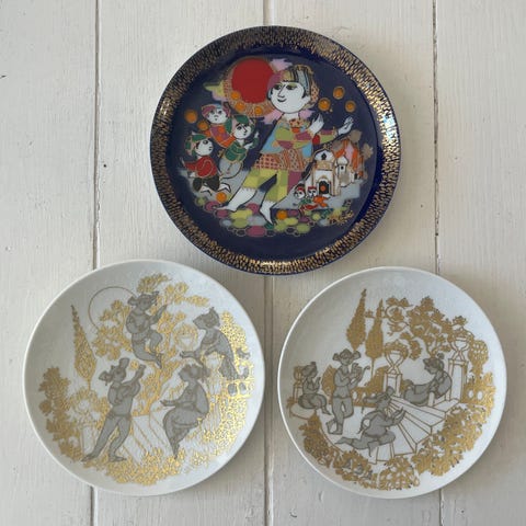 Selger to vakre og fargerike fat designet av Bjørn Wiinblad. Typisk eventyrlig uttrykk med detaljerte figurer, sterke farger og lekent formspråk – ikonisk Wiinblad-stil.