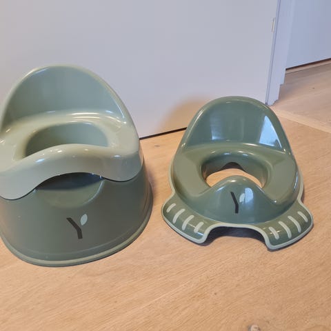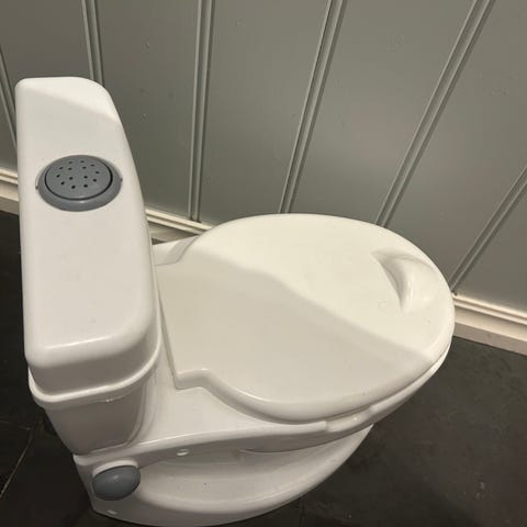 Pent brukt potte som ser ut som et klosett. Har en spyleknapp som lager lyd. Gøy for barnet og kanskje det som skal til for å fikse pottetreninga?