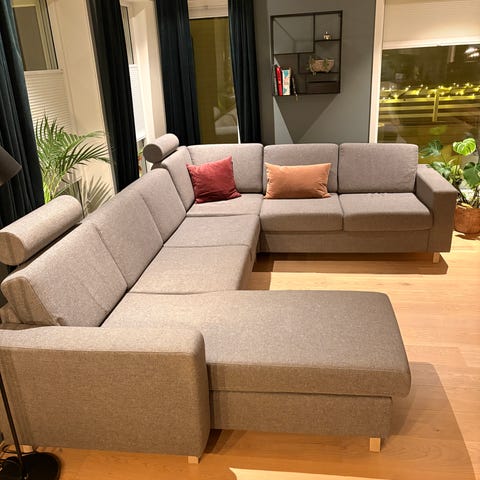 Selger en romslig og komfortabel U-sofa i lys grå/beige farge. Sofaen er pent brukt og har god sittekomfort. Det er noen flekker på to steder (se bilder), men det følger med helt nytt sofatrekk som aldri er brukt, så sofaen kan bli som ny igjen.