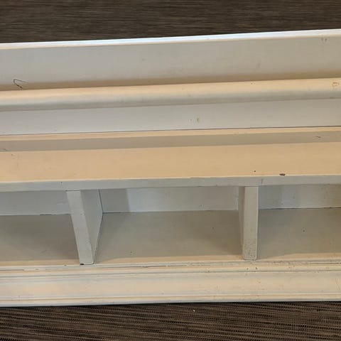 Noe merker på et hjørne, topplaten og en av platene i hyllen (se bilder).