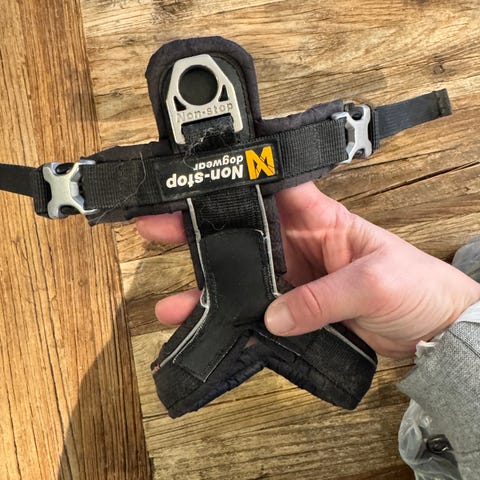 Non-stop Dogwear sele i blå farge. Justerbar sele. Hunden har bitt på det ene feste.