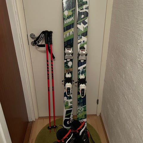 Skiene er i god stand, men har noen bruksmerker.
