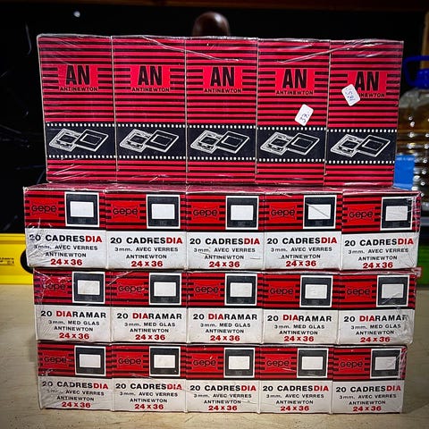 Kassetter til lysbildefremvisning, hver kassett har plass til 36 bilder.