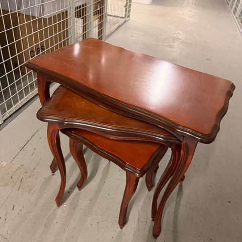 Selger et pent sett med tre innskyvbare bord i massivt tre. Bordene har klassisk utførelse med dreide ben og varm trefarge. Praktiske og plassbesparende – kan brukes samlet eller hver for seg som sidebord, sofabord eller avlastningsbord.