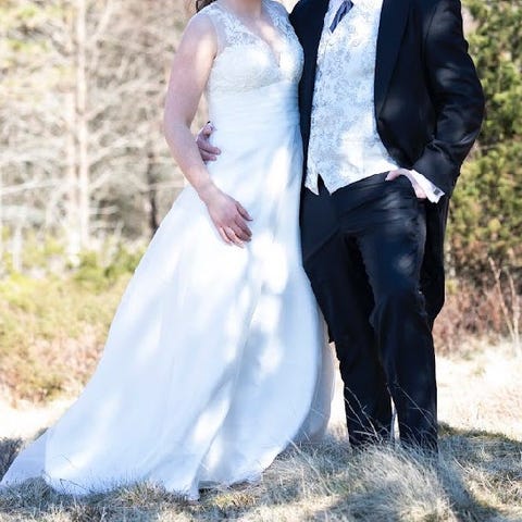 Jeg passet kjolen rett etter fødsel, men den er sydd inn noe rett før bryllupet. Den kan nok tilpasses en S, M og L.