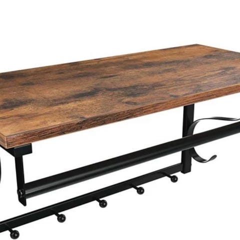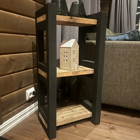 Unik hylle laget av gamle materialer. Kan brukes både ute og inne.