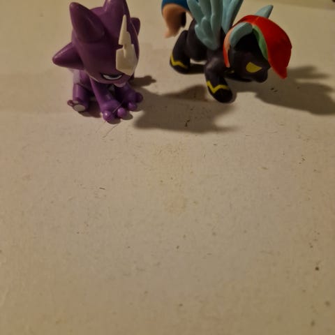 Fem My Little Pony lekefigurer selges samlet, litt ulike, deriblant Rainbow Dash, alle med Hasbro-stempel under. Også Rarity, Applejack og Celestia (som mangler vingene) 8 cm høy.