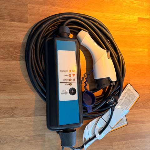 Nødlader til Audi etron med schuko kontakt og type 2. følger med blå industrikontakt. Fungerer også til andre el biler med type 2 kontakt.