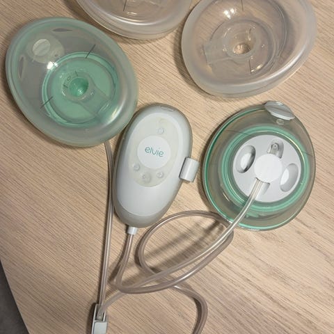 Nesten helt nytt sett med Elvie pumper. Det var teknisk feil på mine to andre og jeg fikk tilsendt nye fra Elvie rett før jeg sluttet å pumpe. Mottok nye i august 2025. Sluttet å pumpe i september 2025.