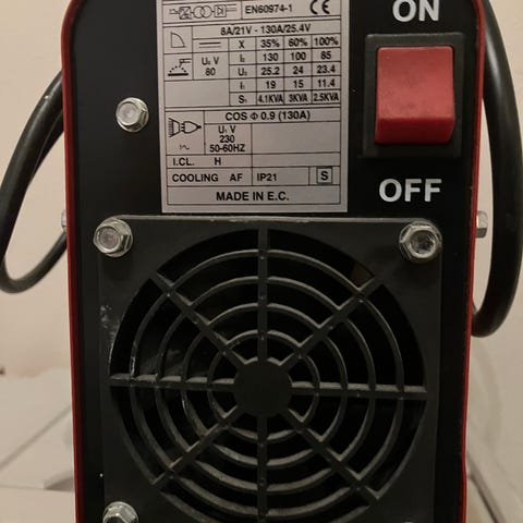Telwin MAXMIG 180/2 Turbo MIG-sveisemaskin med tilhørende gassflaske, sveisetråd og kabler. Maskinen har justerbare innstillinger for sveising og er egnet for MIG-sveising. Leveres med regulator og slanger for gasskontroll.