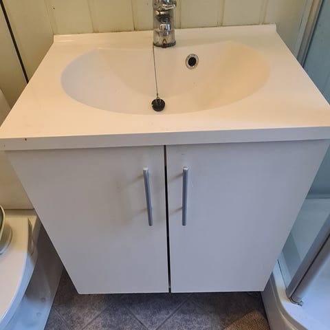 Baderomsinnredning bestående av servant med benkeplate og speilskap med hyller. Farge: hvit. Materiale: tre og keramisk servant.Bredde 1,20m.Gis bort mot rask henting.