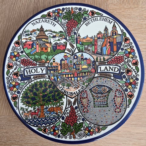Dette er minner kjøpt i Jerusalem. De to veggplattene og kruset er ekte armensk keramikk lagd i Israel. Håndmalt. Den ene viser silhuett av Jerusalem, den andre er av Sinai steinbukker. Du kan se ville steinbukker nesten over alt.