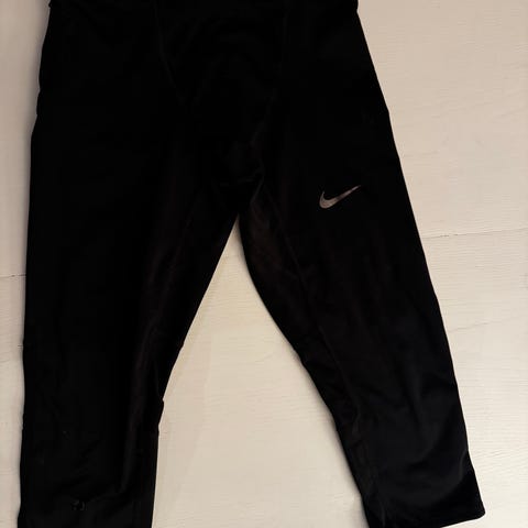 Nike Dri-FIT 3/4 tights størrelse S for herre. Fargen er svart, og materialet er polyester. Bukser er laget med Dri-FIT teknologi som bidrar til fukttransport for bedre komfort under aktivitet. Pent og lite brukt