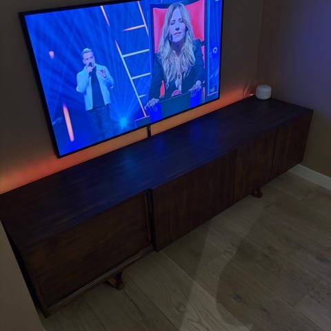 I midt-delen av TV-benken er det to hyller og en veldig praktisk og romslig skuff. På hver side er det en skapdør med en hylle over..
