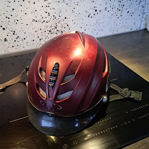 Hjelmen har flere ventilasjonsåpninger for luftgjennomstrømning og justerbar stropp for tilpasning.