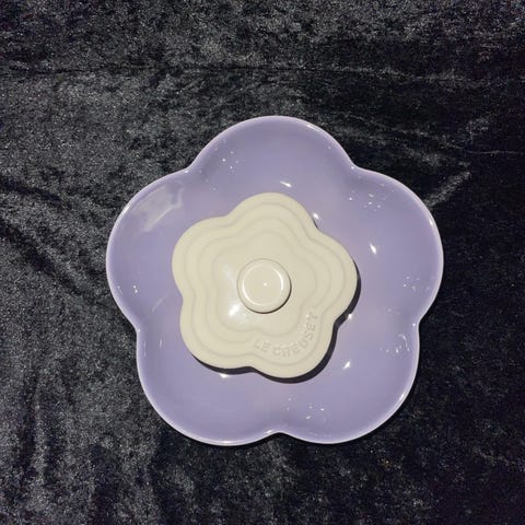 Le Creuset blomsterformet (Flower Collection) skål i blå og ramekin i rosa selges samlet for 800,-.