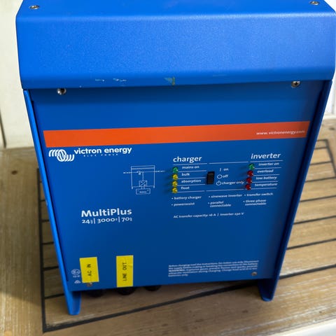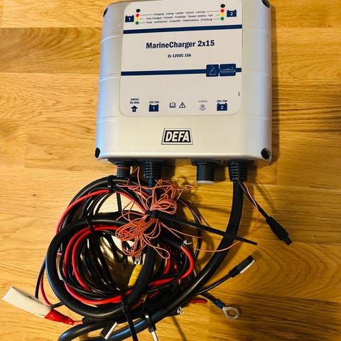 Defa MarineCharger 1x20A batterilader med kabler for tilkobling. Enheten er designet for lading av batterier i marineapplikasjoner og har indikatorlys for AC-inngang, fjernkontroll-LED og DC-utgang.