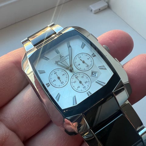 Klokken er nesten ubrukt (kun prøvd noen ganger), i meget god/ny stand: ingen riper på kasse/glass. Ser ut som ny!