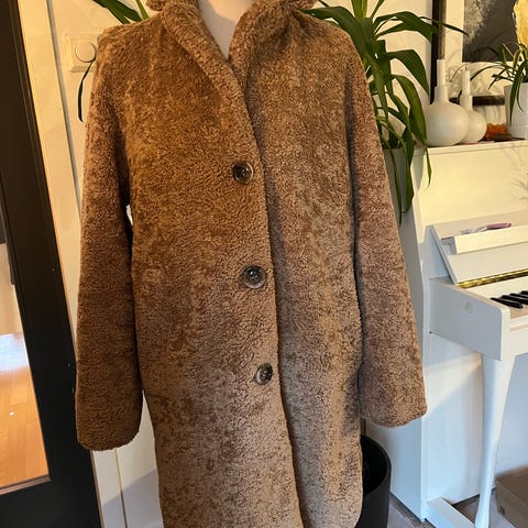 Gustav kåpe i beige fuskeskinn. Plagget er designet for dame og har størrelse 38. Materialet gir en myk og varm overflate. Romslig i størrelsen.